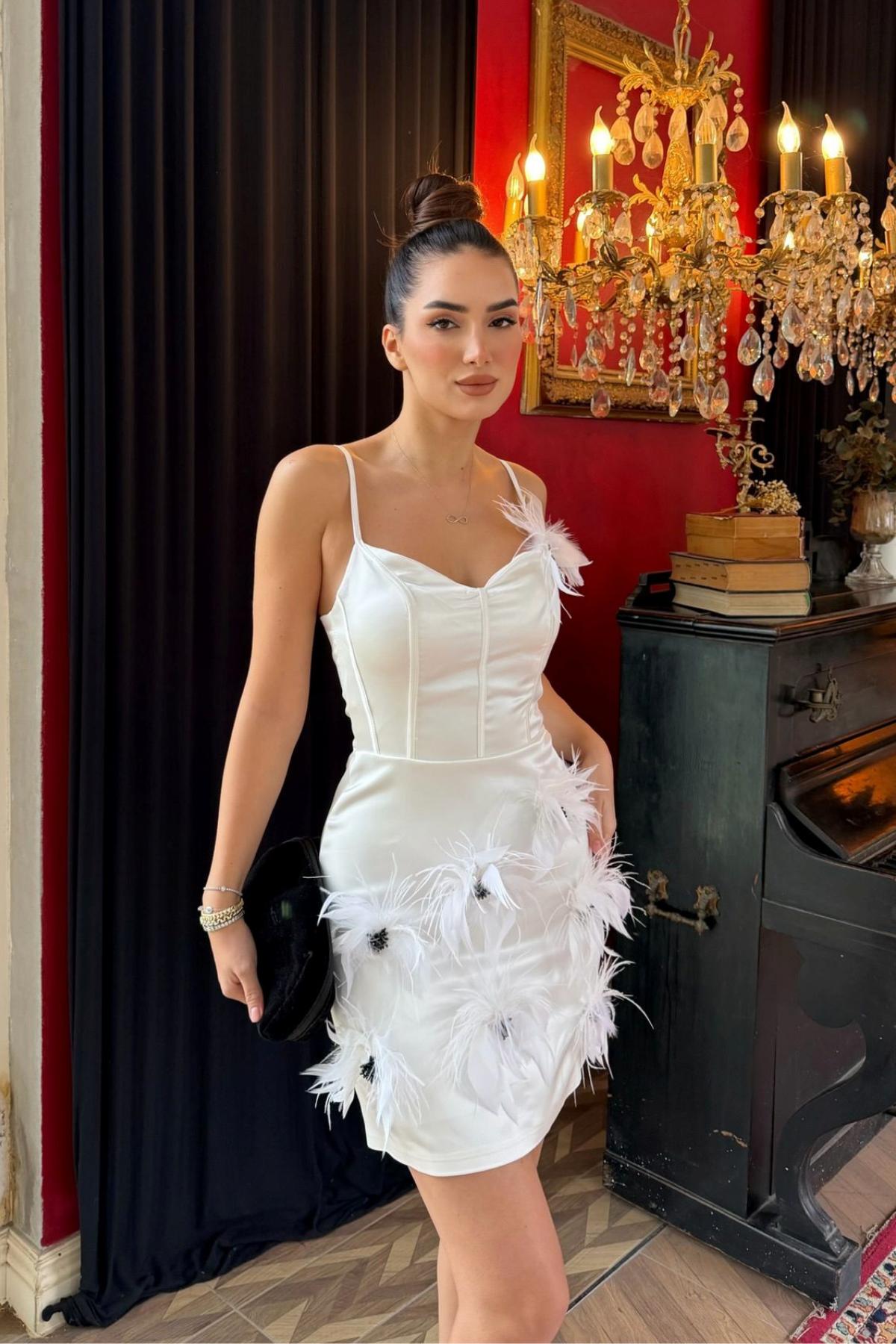Bihter Askılı Çiçek Detaylı Tasarım Mini Elbise 9375 Beyaz