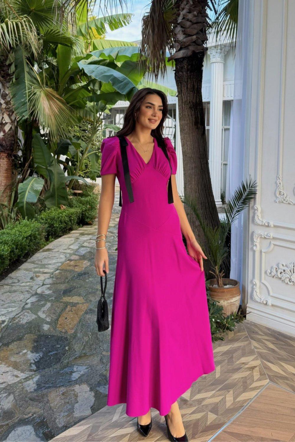 Sienna V Yaka Omuz Detaylı Midi Elbise 9357 Fuşya
